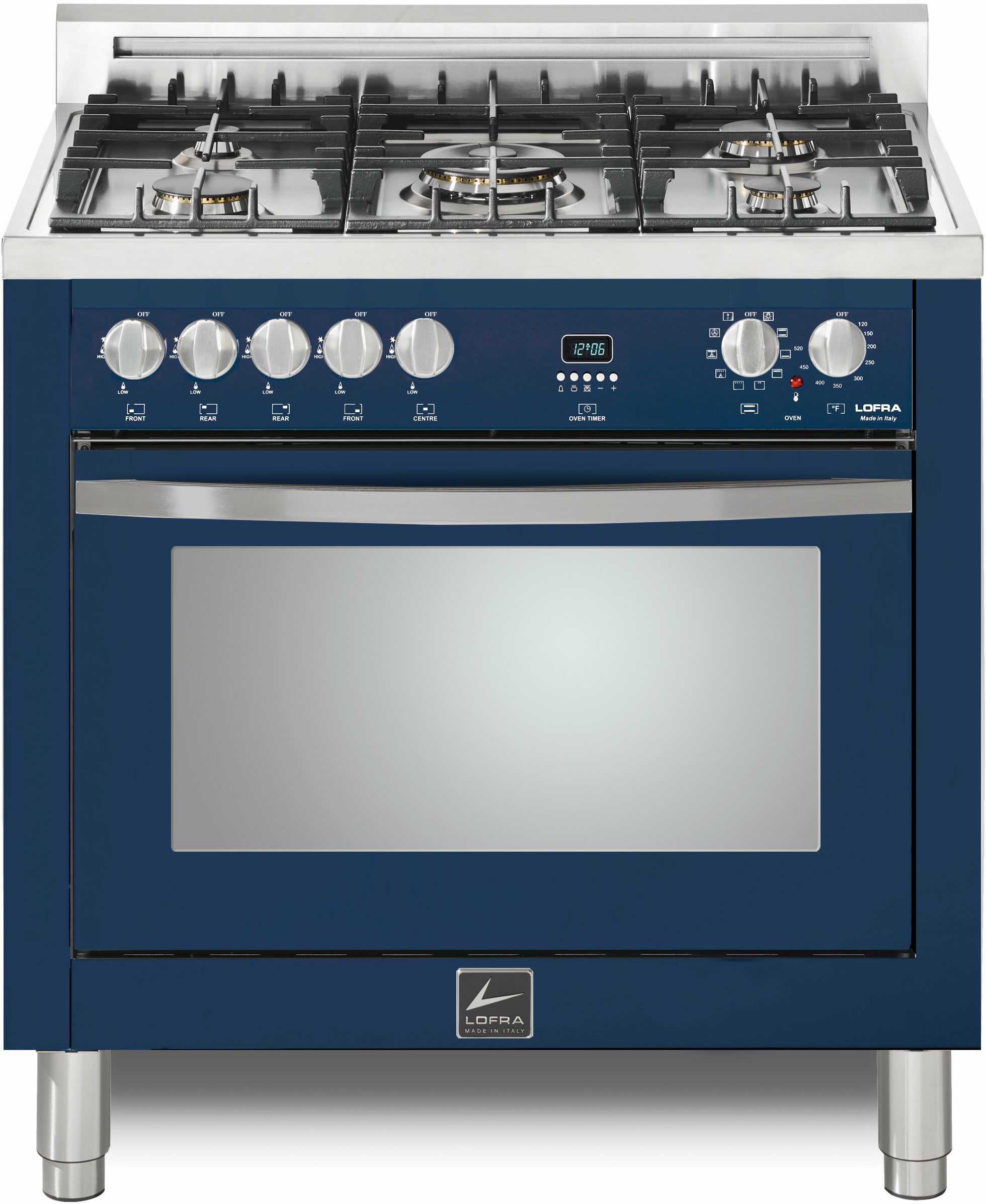 LOFRA® Curva 36" Blue Pro Style Dual Fuel Range features 5 brass burners and matte black burner caps, ventilated doors with Cooling System, height adjustable stainless steel legs, and a large multifunction convection oven: 9 cooking modes.Read More